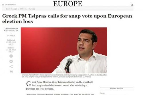 Για «εκλογική ήττα» του ΣΥΡΙΖΑ μετά την οποία ο Τσίπρας ανακοίνωσε πρόωρη προσφυγή στις κάλπες κάνει λόγο η τουρκική Daily Sabah στην αγγλική της έκδοση.