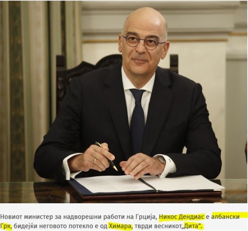 Ο νέος υπουργός Εξωτερικών της Ελλάδας, Νίκος Δένδιας, είναι «Αλβανο-Έλληνας», λόγω της καταγωγής του, υποστηρίζει η εφημερίδα των Τιράνων ‘Dita’.