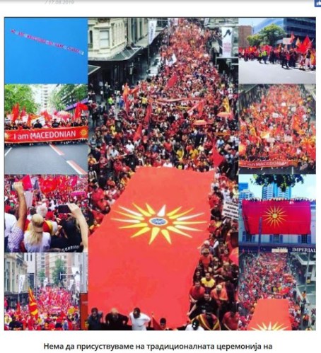 «Δεν θα συμμετάσχουμε στην παραδοσιακή τελετή έπαρσης της σημαίας στην πλατεία της Μελβούρνης στις 8 Σεπτεμβρίου του τρέχοντος έτους», ανακοίνωσε το Σλαβομακεδονικό Συμβούλιο της Μελβούρνης και της Βικτώριας στην Αυστραλία.