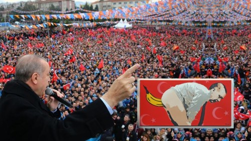 Η πρόθεση των διοργανωτών της έκθεσης να συμπεριλάβουν το συγκεκριμένο έργο, που αποτελεί τμήμα μίας απεικονίσεως που τιτλοφορείται «Despots Series», έχει προκαλέσει τις εντονότατες αντιδράσεις της Άγκυρας. Στην ίδια σειρά εκθεμάτων γελοιοποιούνται και άλλες διεθνείς προσωπικότητες, όπως ο Βορειοκορεάτης δικτάτωρ Κιμ, ο εξαιρετικά αμφιλεγόμενος Ντόναλντ Τραμπ κ.ά. Ο Αμερικανός πρόεδρος απεικονίζεται στο καρτούν ως πίθηκος με μία μπανάνα στο στόμα, ενώ ο Κιμ να «ιππεύει» μπανάνα – βαλλιστικό πύραυλο.