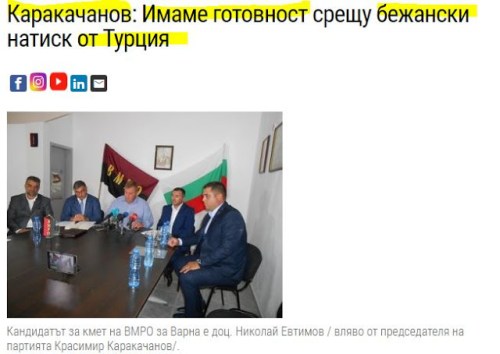 Από την Τουρκία δεν μπορεί να αποκλειστεί η αποστολή μεταναστών στη Βουλγαρία ως εργαλείο πίεσης, δήλωσε ο αντιπρόεδρος της κυβέρνησης και υπουργός Άμυνας, Κρασιμίρ Καρακατσάνοφ στη Βάρνα.