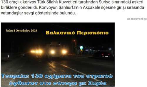 Αυτοκινητοπομπή 130 οχημάτων του τουρκικού στρατού έφθασε στα σύνορα με τη Συρία, νωρίς σήμερα το βράδυ.