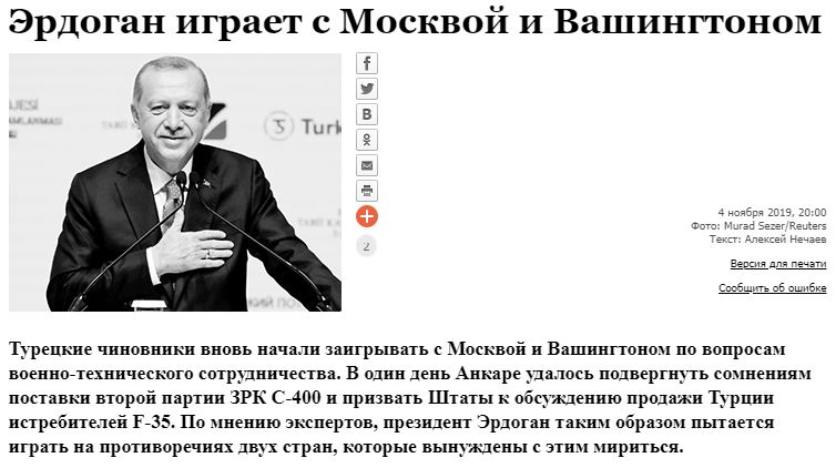 Την ίδια στιγμή, ο διευθυντής του Κέντρου Μελετών της Μέσης Ανατολής και της Κεντρικής Ασίας, Σέμιον Μπαγντάσαροφ, πιστεύει ότι ο Ερντογάν μπορεί να παίζει ασταμάτητα με αντιφάσεις προς τη Ρωσία, τις Ηνωμένες Πολιτείες και άλλες χώρες του ΝΑΤΟ.