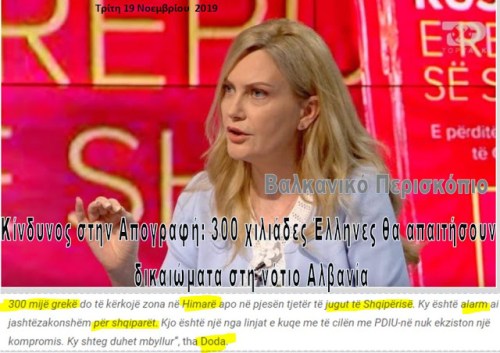 300 χιλιάδες Έλληνες θα απαιτήσουν (μειονοτικές) περιοχές στη Χιμάρα ή στην υπόλοιπη νότια Αλβανία (βόρειο Ήπειρο). Αυτός είναι ένας τεράστιος συναγερμός για τους Αλβανούς. Είναι μια κόκκινη γραμμή για την οποία το PDIU δεν δέχεται κανέναν συμβιβασμό. Αυτός ο δρόμος πρέπει να κλείσει», είπε η Ντόντα.