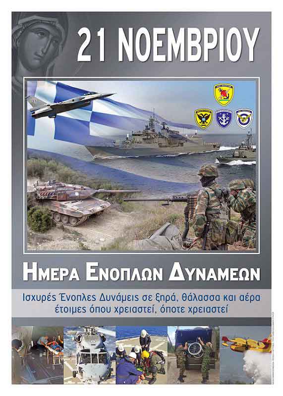 Σήμερα 21 Νοεμβρίου γιορτάζουν οι Ελληνικές Ένοπλες Δυνάμεις. Ανήμερα της Εορτής των Εισοδίων της Θεοτόκου, γιορτάζεται η Ημέρα των Ενόπλων Δυνάμεων με πρωτοβουλία της Ελληνικής Πολιτείας προκειμένου να τιμηθεί η προσφορά των Ελληνικών Ενόπλων Δυνάμεων προς το Έθνος, τόσο σε περίοδο πολέμων, όσο και στην ειρήνη.
