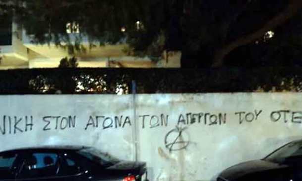 Συνθήματα έξω από το σπίτι του διευθύνοντος συμβούλου του ΟΤΕ, Μιχάλη Τσαμάζ, στα βόρεια προάστια, έγραψαν μέλη του Ρουβίκωνα, σε παρέμβασή τους αργά το βράδυ της Τετάρτης.