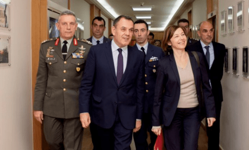 Η κ. Φλοράνς Παρλί έγινε δεκτή με κάθε επισημότητα στο στρατόπεδο «Παπάγου» όπου συναντήθηκε με τον Έλληνα ομόλογό της κ. Νίκο Παναγιωτόπουλο.