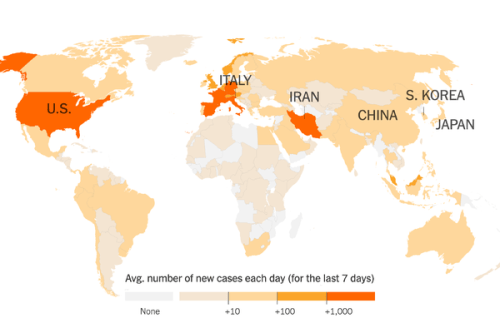 Μετά την Κίνα και την Ιταλία, οι χώρες που πλήττονται περισσότερο είναι το Ιράν (1.433 θάνατοι και 19.644 κρούσματα), η Ισπανία με 1.002 θανάτους και 19.980 κρούσματα, η Γαλλία (450 θάνατοι, 12.612 κρούσματα) και οι ΗΠΑ (205 θάνατοι, 14.250 κρούσματα).
