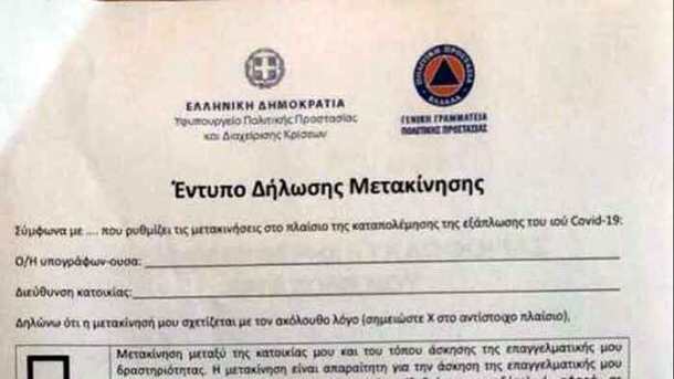 Για κάθε μια από αυτές τις περιπτώσεις οι πολίτες θα πρέπει να έχουν μαζί τους την ταυτότητα ή το διαβατήριό τους και το έντυπο δήλωσης μετακίνησης, το οποίο μπορούν να βρουν στην ιστοσελίδα που δημιουργείται και θα τεθεί σε λειτουργία από απόψε το βράδυ στην ηλεκτρονική διεύιθυνση http://www.forma.gov.gr