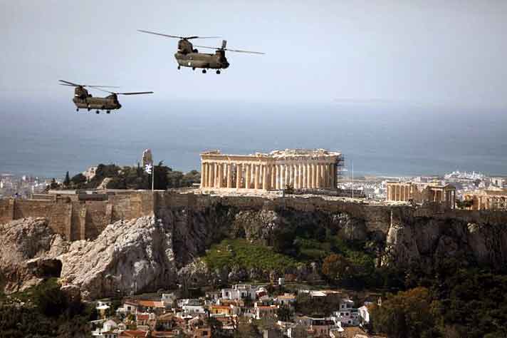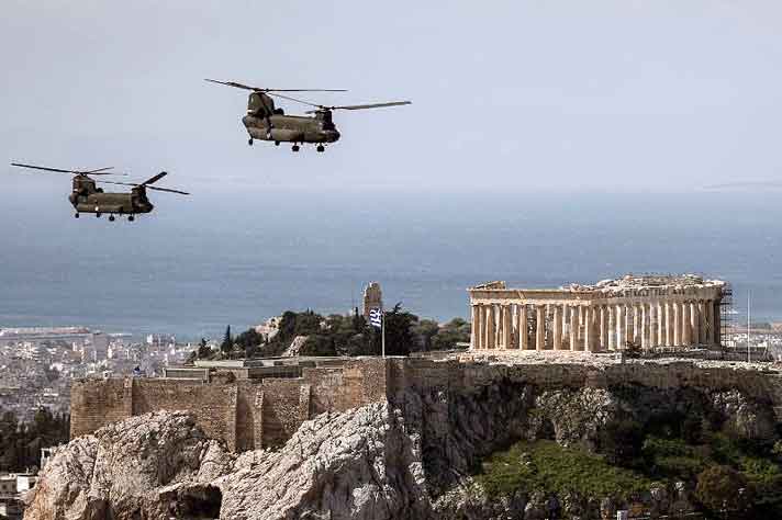 Κατά τη διάρκεια της κατάθεσης στεφάνου προς τιμήν των ηρώων της Επανάστασης του 1821, πάνω από την πλατεία Συντάγματος θα πραγματοποιηθεί διέλευση 4 μαχητικών αεροσκαφών Mirage 2000/-5 της Πολεμικής Αεροπορίας και 6 ελικοπτέρων της Αεροπορίας Στρατού και του Πολεμικού Ναυτικού.
