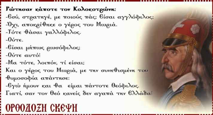 Εγώ ν’ αντενεργήσω; Μα δε ξέρετε λοιπόν κι εσείς οι ίδιοι κι όλοι οι Έλληνες πόσο πάσκισα στον καιρό του σηκωμού ν’ αποχτήσει το έθνος κεφαλή και να μου λείψουν οι φροντίδες; Άμα ο Θεός μου ‘δωσε Βασιλέα, εγώ είπα σ’ όλους τους φίλους μου: «Τώρα είμ’ ευτυχισμένος. Θα κρεμάσω την κάπα μου στον κρεμανταλά και θα πλαγιάσω στην καλύβα μου ν’ αποθάνω ήσυχος κι ευχαριστημένος».