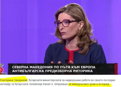 Η Αικατερίνα Ζαχαρίεβα, υπουργός Εξωτερικών της Βουλγαρίας, αναφέρθηκε στη μακεδονική γλώσσα και την ιστορία στην τελευταία συνέντευξή της στο 3ο βουλγαρικό κανάλι (Канал 3), σημειώνει η Βέτσερ των Σκοπίων.