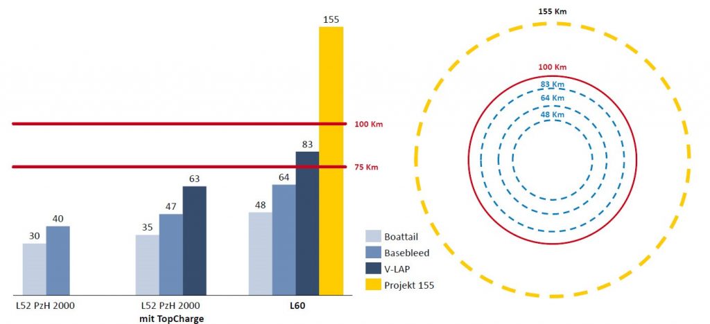 Η επίτευξη βεληνεκούς 76,2 χλμ. από το G6-52, ένα πυροβόλο που δεν πληροί κριτήρια του Μνημονίου Κατανοήσεως Διακλαδικών Βαλλιστικών (JBMoU) του ΝΑΤΟ, ενισχύει τα σχέδια της Rheinmetall να αναπτύξει ένα νέο πυροβόλο 155 mm με διευρυμένη θαλάμη και μήκος σωλήνα 60 διαμετρημάτων. Το μελλοντικό πυροβόλο, συμβατό με πυρομαχικά μεγάλου βεληνεκούς προτύπου JBMoU αλλά και νέων οικογενειών, θα επιτυγχάνει βεληνεκές 83 χλμ.! Η συγκεκριμένη επίδοση θα είναι το σημείο αναφοράς, δεδομένου ότι λόγω των σχετικών διορθώσεων που θα γίνονται κατά την διάνυση της τροχιάς προκειμένου να επιτευχθεί ακρίβεια πυρός, η μέγιστη επιτεύξιμη επίδοση θα ανέρχεται στα 75 χλμ. όπως έχει τεθεί και ως απαίτηση.