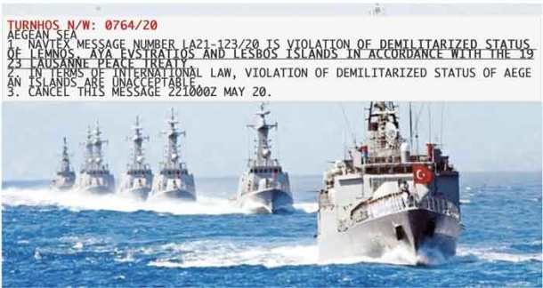 Η Τουρκία προσπαθώντας να πείσει πρώτα απ΄ όλα την ίδια ότι “κάνει κουμάντο” στο Αιγαίο, συνεχίζει την τακτική των “αντι-Navtex”, με τις οποίες χαρακτηρίζει “παράνομες” ελληνικές ασκήσεις σε νησιά που η ίδια επιμένει να θεωρεί “αποστρατικοποιημένα”, επικαλούμενη τη Συνθήκη της Λωζάνης.