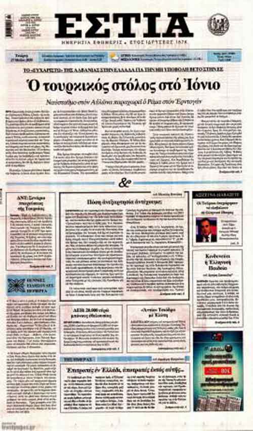 Η εφημερίδα αναλύει την στρατηγική περικυκλώσεως της Ελλάδας που επιχειρεί η Άγκυρα, αξιοποιώντας την επιρροή που διαθέτει στην κυβέρνηση των Τιρράνων, κάτι που εφόσον υλοποιηθεί θα επιτρέψει την δημιουργία ενός στρατηγικού προγεφυρώματος για τα τουρκικά πολεμικά πλοία.