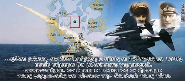 Οι απειλές ότι δεν θα γίνει μέλος της ΕΕ, ή οι δηλώσεις Ελλήνων αξιωματούχων ότι η χώρα τους είναι έτοιμη για πόλεμο;», συμπληρώνοντας πως η Ελλάδα δεν έχει καμία ελπίδα απέναντι στην Τουρκία που διαθέτει ένα από τους δέκα πιο ισχυρούς Στρατούς στον κόσμο.