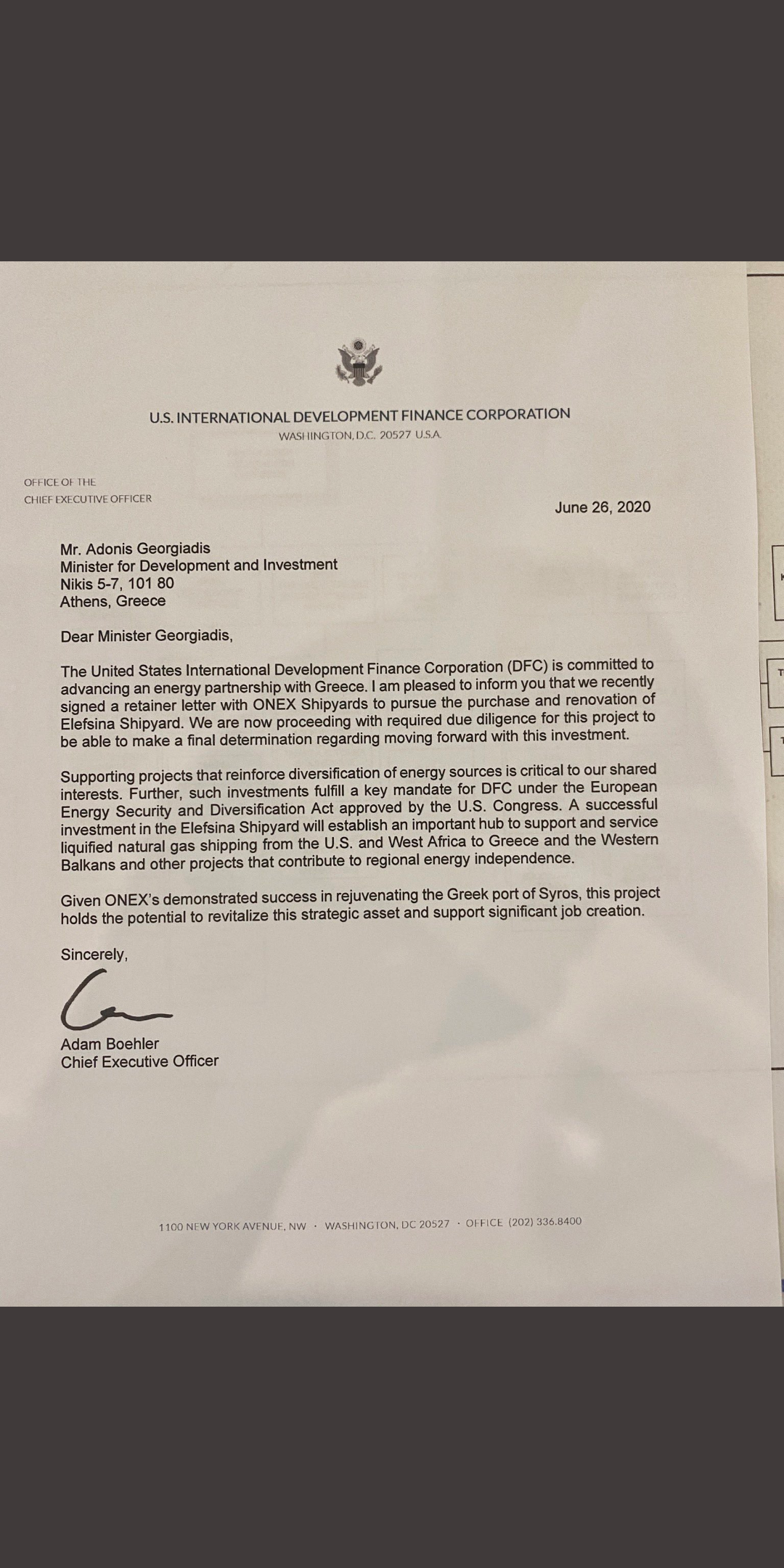 Ο υπουργός έδωσε στη δημοσιότητα και την επίσημη επιστολή εκδήλωσης ενδιαφέροντος, την οποία μάλιστα υπογράφει ο επικεφαλής της “αμερικανικής υπηρεσίας χρηματοδότησης αναπτυξιακών έργων” (DFC) Άνταμ Μπόλερ.