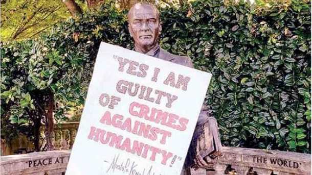 «Ναι, είμαι ένοχος για εγκλήματα κατά της ανθρωπότητας» γράφτηκε στην αγγλική γλώσσα σε ένα πανό που κρεμάστηκε στο άγαλμα.
