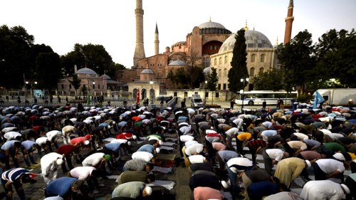 Την 24η Νοεμβρίου 1934 ο Μουσταφά Κεμάλ, ο ιδρυτής της πολύ νεαρής Τουρκικής Δημοκρατίας, μετέτρεπε την πρώην βασιλική, ακόμη ισλαμικό τέμενος, σε μουσείο, όμως «86 χρόνια αργότερα, τη 10η Ιουλίου 2020, ο πρόεδρος Ρετζέπ Ταγίπ Ερντογάν, έκανε το κόσμημα της Κωνσταντινούπολης μουσουλμανικό χώρο λατρείας, προς μέγιστη ικανοποίηση της πιο συντηρητικής θρησκευτικής μερίδας του εκλογικού του ακροατηρίου και των συμμάχων στην άκρα δεξιά» της Τουρκίας, σχολίασε στο δικό της ρεπορτάζ η εφημερίδα Le Monde.