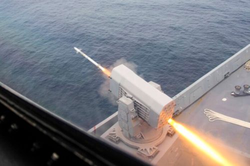 ATLANTIC OCEAN (Oct. 14, 2018) The amphibious transport dock ship USS Arlington (LPD 24) fires a rolling airframe missile (RAM) during a live-fire missile exercise for the Carrier Strike Group (CSG) 4 composite training unit exercise (COMPTUEX). COMPTUEX is the final pre-deployment exercise that certifies the combined Kearsarge Amphibious Ready Group (ARG) and the 22nd Marine Expeditionary Unit’s (MEU) planning and execution of challenging and realistic training scenarios. CSG 4 mentors, trains and assesses East Coast units preparing for future deployments. (U.S. Navy photo by Information Systems Technician Seaman Jeanae Torres/Released)181014-N-NG663-0042