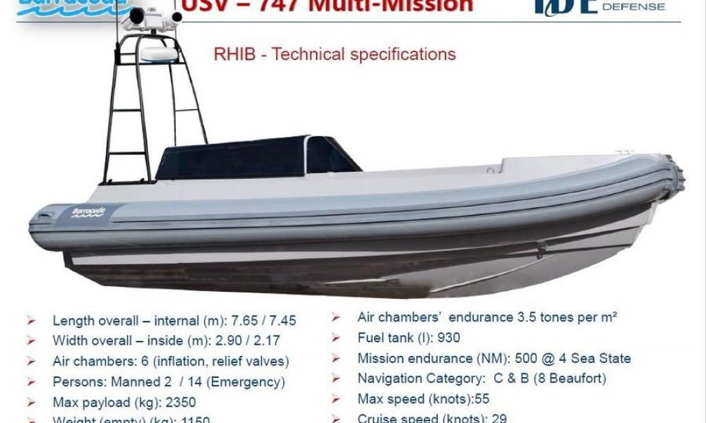 Πρόκειται για το πολλαπλών χρήσεων USV-747 το οποίο μπορεί να επιχειρήσει με καιρό άνω των επτά μποφόρ και έχει εμβέλεια δράσης 500 ναυτικά μίλια.