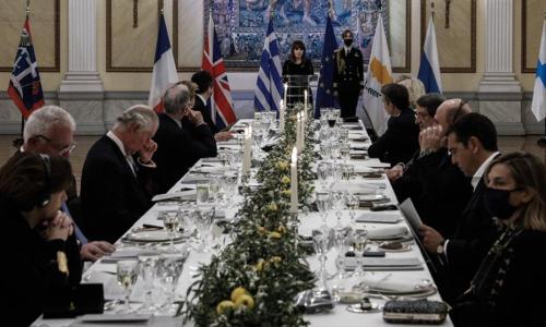 Το επίσημο δείπνο ξεκίνησε στις 20.30 με την προσφώνηση από την Πρόεδρο της Ελληνικής Δημοκρατίας και αντιφωνήσεις των υψηλών προσκεκλημένων: Ο πρίγκιπας Κάρολος και η δούκισσα της Κορνουάλης Καμίλα, ο Ρώσος πρωθυπουργός Μιχαήλ Μισούστιν, ο πρόεδρος της Κύπρου Νίκος Αναστασιάδης με την σύζυγό του Αντρη, η Γαλλίδα υπουργός Αμυνας Φρανσουά Παρλί.