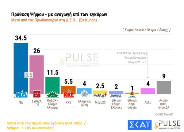 Η πρόθεση ψήφου για τη ΝΔ μετά τη ΔΕΘ ανέρχεται στο 34,5%, ενώ για τον ΣΥΡΙΖΑ στο 26,5%.