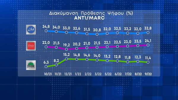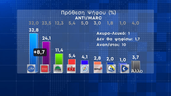 Δημοσκόπηση: Η Νέα Δημοκρατία συνεχίζει να προηγείται με 8,7% του ΣΥΡΙΖΑ στην πρόθεση ψήφου των πολιτών, σύμφωνα με την έρευνα της Marc για λογαριασμό του κεντρικού δελτίου ειδήσεων του ΑΝΤ1.