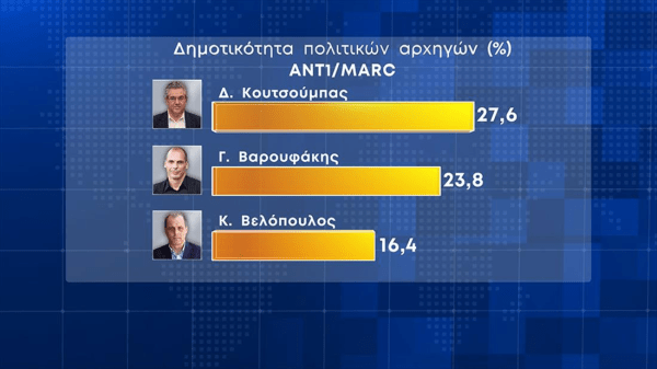 Στη δημοτικότητα των πολιτικών αρχηγών, ο Κυριάκος Μητσοτάκης προηγείται με 48,6% ενώ δεύτερος είναι ο Νίκος Ανδρουλάκης με 35,8% και ακολουθεί ο Αλέξης Τσίπρας με 35,3%. Ο Δημήτρης Κουτσούμπας είναι ο επόμενος με 27,6%, τον ακολουθεί ο Γιάνης Βαρουφάκης με 23,8% ενώ 16,4% συγκεντρώνει ο Κυριάκος Βελόπουλος.