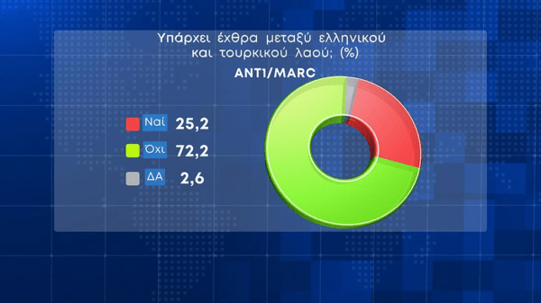 Τέλος, σε ερώτηση για το αν οι Έλληνες πολίτες πιστεύουν ότι ο τουρκικός λαός είναι εχθρικός το 72,2% απάντησε αρνητικά ενώ το 25,2% απάντησε θετικά.