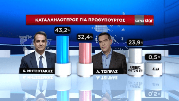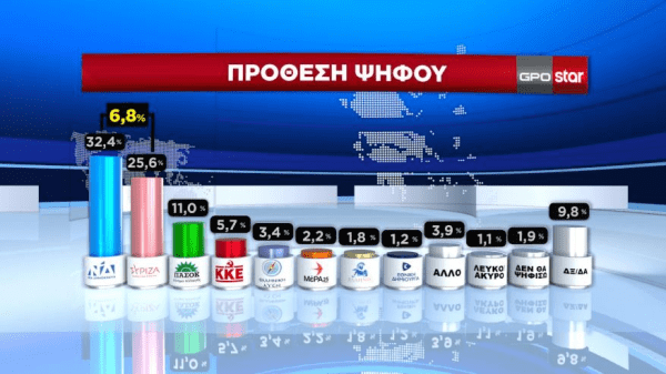 Διαφορά της τάξεως των 6,8 ποσοστιαίων μονάδων καταγράφει μεταξύ Νέας Δημοκρατίας και ΣΥΡΙΖΑ δημοσκόπηση της GPO για λογαριασμό του Star.