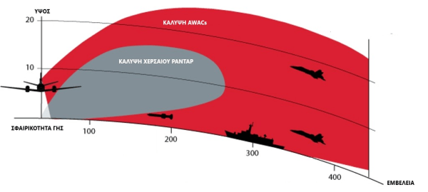 Στις δύο αυτές απεικονίσεις φαίνεται η τεράστια επιχειρησιακή αξία των ελληνικών ΑΣΕΠΕ. Οι αποστάσεις και τα ύψη αποκάλυψης ακόμη και μικρών και χαμηλά ιπτάμενων στόχων όπως οι πύραυλοι οριζόντιας πλεύσης (180 χιλιόμετρα ή 100 ναυτικά μίλια) που εξασφαλίζει το ραντάρ PS-890 Erieye είναι ασύγκριτα μεγαλύτερα σε σχέση με αυτά επίγειων ραντάρ.