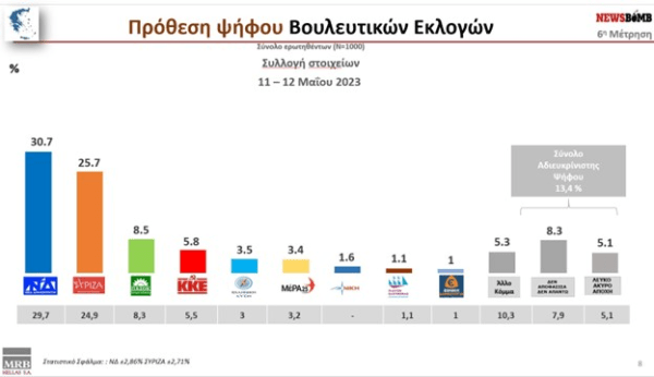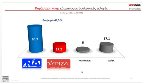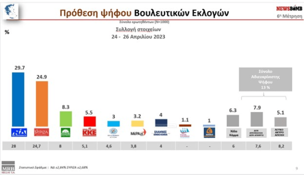 Στην δημοσκόπηση της MRB η διαφορά μεταξύ των δύο κομμάτων Νέας Δημοκρατίας και ΣΥΡΙΖΑ σε ότι αφορά την πρόθεση ψήφου φαίνεται να διαμορφώνεται στις 5 μονάδες η Νέα Δημοκρατία βρίσκεται στο 30,7% σε αντίθεση με το ΣΥΡΙΖΑ που βρίσκεται στο 25,7%. Στην ίδια μέτρηση το σύνολο της αδιευκρίνιστης ψήφου κυμαίνεται στο 13,4% ενώ εκτός Βουλής μένει το κόμμα Νίκη με ποσοστό 1,6%, η Πλεύση Ελευθερίας της Ζωής Κωνσταντοπούλου με ποσοστό 1,1% και η Εθνική Δημιουργία με 1%.