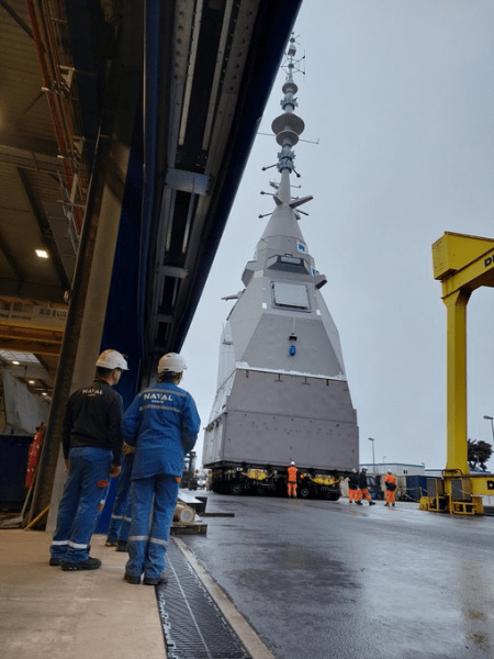 Στην φωτογραφία που δημοσίευσε η γαλλική εταιρεία, φαίνεται το κέντρο δεδομένων της φρεγάτας να μετακινείται προς τον χώρο των δοκιμών μέσα στο ναυπηγείο του Λοριάν, στη Γαλλία.