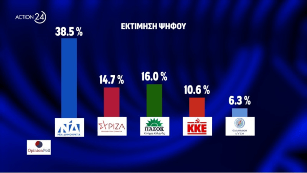 Στην εκτίμηση ψήφου, τα κόμματα συγκεντρώνουν τα εξής ποσοστά: Νέα Δημοκρατία 38,5%, ΣΥΡΙΖΑ 14,7%, ΠΑΣΟΚ 16%, ΚΚΕ 10,6%, Ελληνική Λύση 6,3%, Σπαρτιάτες 3%, Πλεύση Ελευθερίας 2,5%, Νίκη 3,9%, ΜέΡΑ25 2,4%.