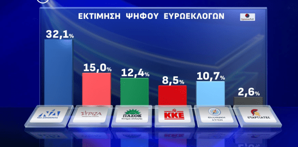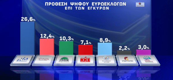 Στην πρόθεση ψήφου για τις ευρωεκλογές η ΝΔ συγκεντρώνει μόλις το 26,6% των ψήφων ενώ ο ΣΥΡΙΖΑ βρίσκεται στο 12,4% με το ΠΑΣΟΚ να ακολουθεί στο 10,3%.