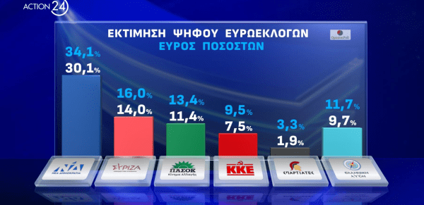 Στην εκτίμηση ψήφου για τις ευρωεκλογές η ΝΔ βρίσκεται στο 32% ( στο εύρος μέχρι 34%) ενώ ο ΣΥΡΙΖΑ είναι δεύτερος με 15%.